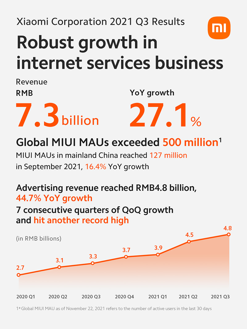 ในขณะเดียวกัน ฐานผู้ใช้งานอินเทอร์เน็ตของเสียวหมี่ทั่วโลกยังเพิ่มขึ้นอย่างรวดเร็วในไตรมาสที่ 3 โดยจำนวนผู้ใช้งานต่อเดือนของ MIUI ทั่วโลก สูงเกินกว่า 500 ล้านผู้ใช้เป็นครั้งแรก จากข้อมูล ณ วันที่ 22 พฤศจิกายน 2564 ซึ่งตัวเลขนี้ถือเป็นก้าวสำคัญของการขยายตลาดตัวโลกของเสียวหมี่ ในเดือนกันยายน 2564 จำนวนผู้ใช้รายเดือนของ MIUI เพิ่มขึ้น 32% จากช่วงเวลาเดียวกันของปีก่อนหน้า หรือคิดเป็น 485.9 ล้านผู้ใช้ โดยเป็นผู้ใช้งานจากประเทศจีน 127.3 ล้านราย สูงขึ้นจากปีก่อนหน้า 16.4% โดยเพิ่มขึ้นเป็นไตรมาสที่ 4 ติดต่อกัน ในเดือนกันยายน 2564 จำนวนผู้ใช้รายเดือนของเสียวหมี่สมาร์ททีวีทั่วโลกและเสียวหมี่บ็อกซ์ (Xiaomi Box) ขยายตัวขึ้นถึง 33% เมื่อเทียบจากช่วงเวลาเดียวกันของปีก่อนหน้า โดยข้อมูล ณ วันที่ 30 กันยายน 2564 จำนวนผู้ใช้บริการแบบเสียค่าสมาชิกอยู่ที่ 4.7 ล้านราย เพิ่มขึ้นจากปีก่อนหน้า 13.5%