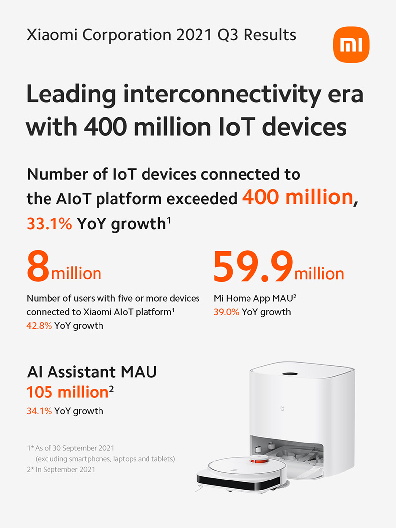 เสียวหมี่ยังขยายแพลตฟอร์ม AIoT อย่างต่อเนื่อง โดย ณ วันที่ 30 กันยายน 2564 เสียวหมี่มีจำนวนอุปกรณ์ AIoT ที่เชื่อมต่อกับแพลตฟอร์ม (ไม่รวมสมาร์ทโฟน แทบเล็ต และคอมพิวเตอร์แล็ปท็อป) เกินกว่า 400 ล้านเครื่องเป็นครั้งแรก และมีจำนวนผู้ใช้งานที่เชื่อมต่ออุปกรณ์ AIoT ของเสียวหมี่ 5 เครื่องหรือมากกว่านั้นขึ้นไป บทแพลตฟอร์มทะลุ 8 ล้านคน