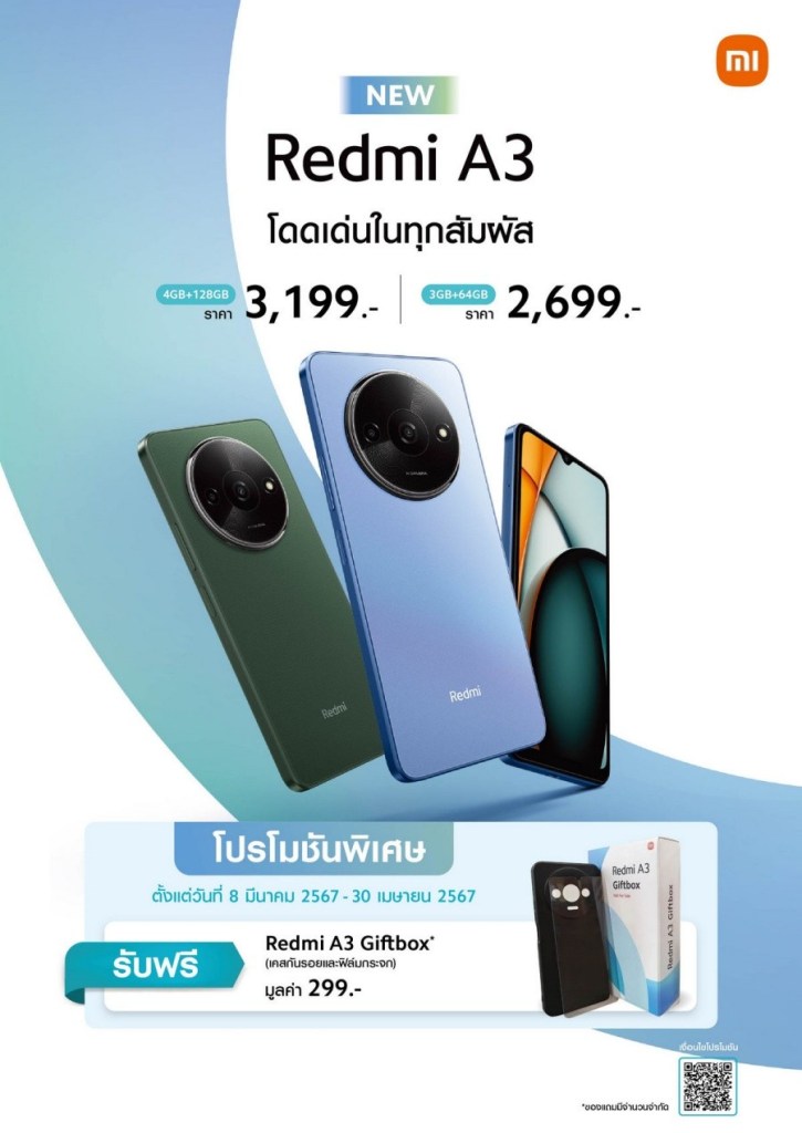 พิเศษ! สำหรับลูกค้าที่ซื้อ Redmi A3 ในระหว่างวันที่ 8 มีนาคม – 30 เมษายน 2567 รับฟรี Redmi A3 Giftbox มูลค่า 299 บาท1