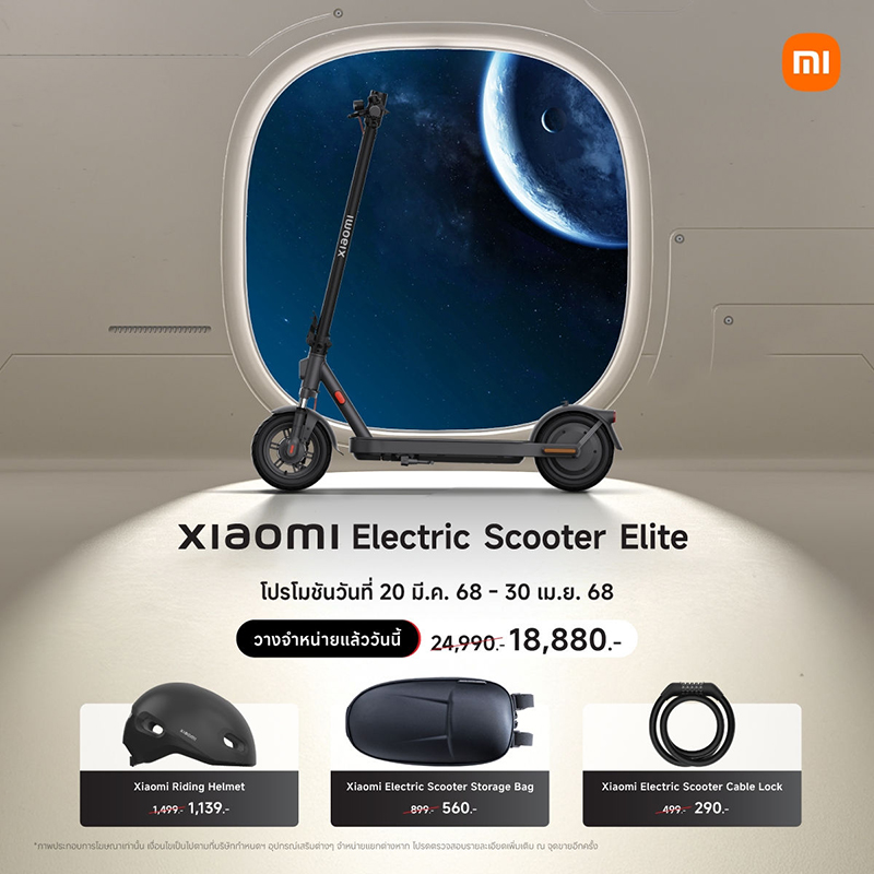 รถสกู๊ตเตอร์ไฟฟ้า Xiaomi Electric Scooter Elite วางจำหน่ายในราคาพิเศษ 18,880 บาท2 (จากราคาปกติ 24,990 บาท) ในระหว่างวันที่ 20 มีนาคม 2568 – 30 เมษายน 2568 ที่ช่องทางการจำหน่ายที่ร่วมรายการ