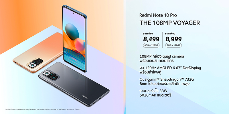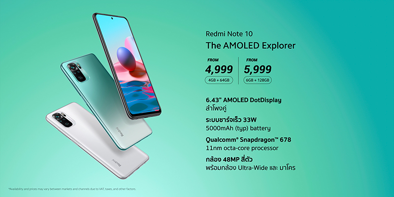 กล้องหลักความละเอียด 108 ล้านพิกเซลใน Redmi Note 10 Pro ให้เก็บโมเมนท์ความประทับใจทุกรายละเอียด หรือเพลิดเพลินกับหน้าจอ AMOLED ความละเอียด FHD+ ใน Redmi Note 10 โดย Redmi Note 10 Pro วางจำหน่ายวันที่ 5 เมษายน ในราคาเริ่มต้นเพียง 8,499 บาท และ Redmi Note 10 วางจำหน่ายวันที่ 19 มีนาคม ในราคาเริ่มต้นเพียง 4,999 บาท