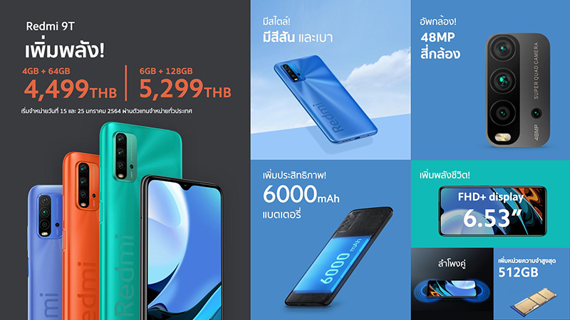 - Redmi 9T ขนาดความจุ 6GB + 128GB ราคา 5,299 บาท วางจำหน่ายตั้งแต่วันที่ 25 มกราคม 2564