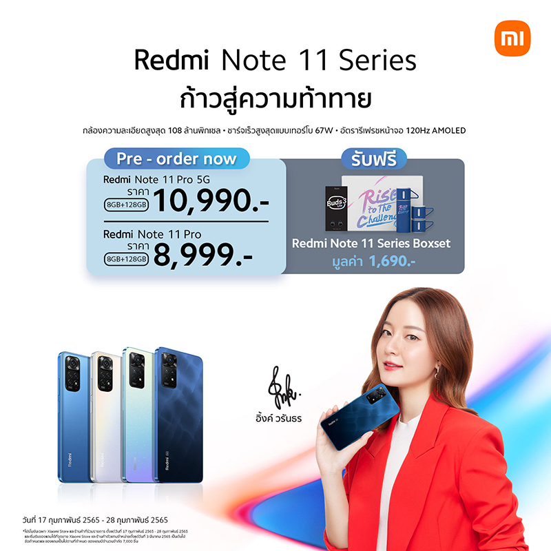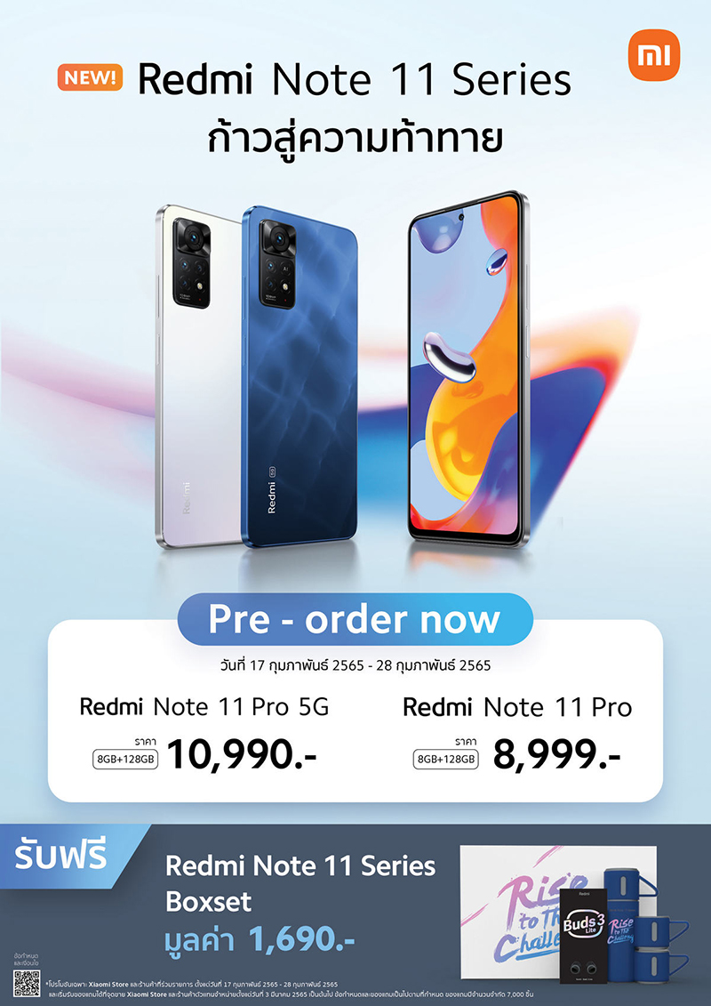 พิเศษ! สำหรับลูกค้าที่สั่งจองสมาร์ทโฟน Redmi Note 11 Pro 5G หรือ Redmi Note 11 Pro ในระหว่างวันที่ 17 – 28 กุมภาพันธ์ 2565 รับฟรี Redmi Note 11 Series Boxset* มูลค่า 1,690 บาท