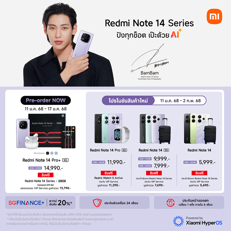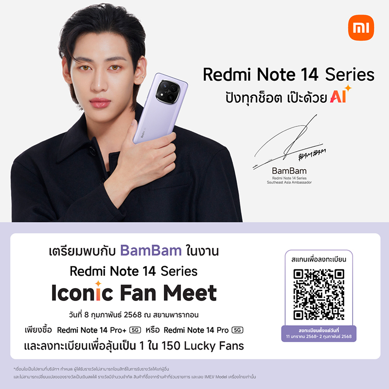 นอกจากนี้ เสียวหมี่ ประเทศไทย ยังมอบสิทธิพิเศษสำหรับลูกค้าที่ซื้อ Redmi Note 14 Pro+ 5G และ Redmi Note 14 Pro 5G เท่านั้น โดยรับสิทธิ์ลุ้นเป็นผู้โชคดีเข้าร่วมงาน Iconic Fan Meet สุดเอ็กซ์คลูซีฟกับ BamBam ซึ่งจะจัดขึ้นในวันที่ 8 กุมภาพันธ์ 2568 ที่สยามพารากอน โดยลูกค้าสามารถลงทะเบียนเพื่อลุ้นเป็น 1 ใน 150 lucky Fans10 ผู้ที่สนใจสามารถดูรายละเอียดเพิ่มเติมได้ที่ Facebook Page ของ Xiaomi Thailand