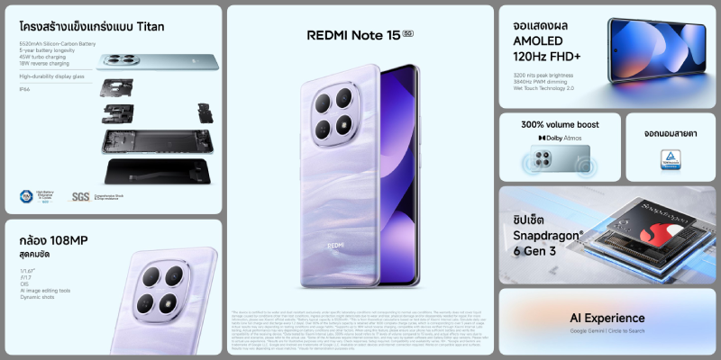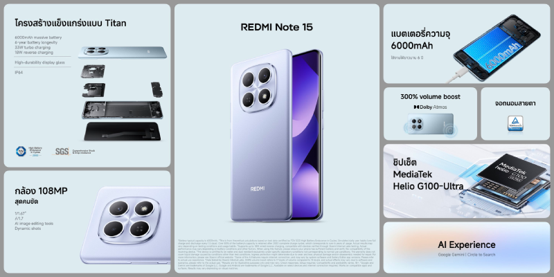REDMI Note 15 Series ถูกออกแบบมาเพื่อตอบโจทย์ความต้องการที่หลากหลายของผู้ใช้งานทั่วโลก ด้วยการผสานจุดเด่นอย่างลงตัว ทั้งด้านความทนทาน การถ่ายภาพ ประสิทธิภาพการทำงาน และการยกระดับประสบการณ์ด้านหน้าจอ โดยพัฒนาบนรากฐานที่เชื่อถือในความทนทานของ REDMI Titan สมาร์ทโฟนซีรีย์นี้จึงพร้อมรองรับการใช้งานในชีวิตประจำวัน ควบคู่ไปกับการมอบคุณภาพการถ่ายภาพอันเหนือระดับ ประสิทธิภาพที่ลื่นไหล และประสบการณ์การใช้งานที่ราบรื่นไร้รอยต่อ