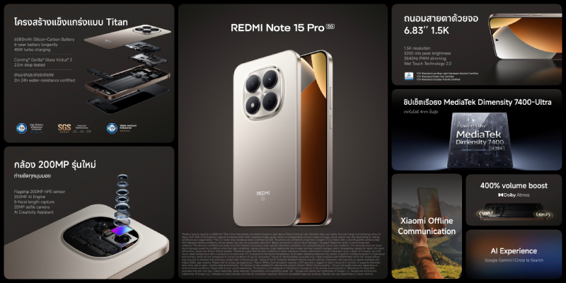 เสียวหมี่ประกาศเปิดตัวสมาร์ทโฟน REDMI Note 15 Series รุ่นใหม่ล่าสุดอย่างเป็นทางการในประเทศไทย โดยประกอบไปด้วยสมาร์ทโฟนทั้งหมด 4 รุ่น ได้แก่ REDMI Note 15 Pro+ 5G, REDMI Note 15 Pro 5G, REDMI Note 15 5G และ REDMI Note 15 ชูจุดเด่นด้านความทนทานระดับไททันของ REDMI สมาร์ทโฟนในซีรีส์นี้ถูกออกแบบมาให้โดดเด่นด้วยประสิทธิภาพแบตเตอรี่ที่ใช้งานได้ยาวนาน ความทนทานต่อการตกกระแทกที่เสริมความแข็งแกร่ง และการป้องกันฝุ่นและน้ำที่ดียิ่งขึ้น ควบคู่ไปกับระบบกล้องที่อัปเกรดใหม่ ในประสิทธิภาพระดับเรือธง รวมถึงประสบการณ์การใช้งานที่ลื่นไหลแบบไร้รอยต่อ