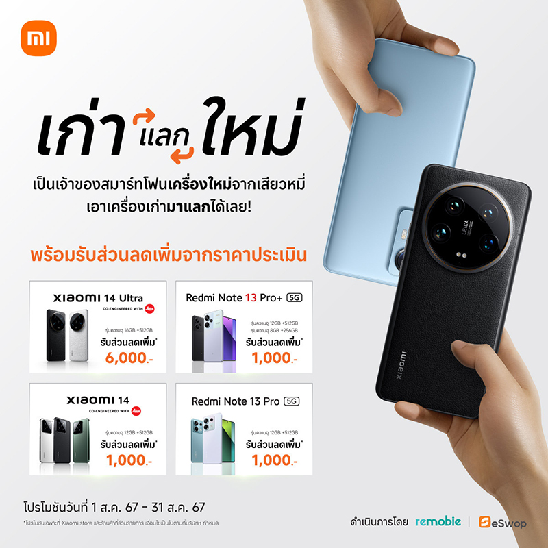 เสียวหมี่ ประเทศไทย ให้คุณเป็นเจ้าของสมาร์ทโฟนรุ่นยอดฮิตอย่าง Redmi Note 13 Series และ Xiaomi 14 Seriesได้ง่ายขึ้นด้วยโปรแกรมพิเศษในช่วงเดือนสิงหาคม อาทิ โปรแกรมการผ่อนจาก SG Finance+1 หรือ โปรแกรมการนำเครื่องเก่ามาแลกเครื่องใหม่ พร้อมรับส่วนลดเพิ่มเติม3 โดยผู้ที่สนใจสามารถสอบถามข้อมูลเพิ่มเติม ได้ที่ Xiaomi Store และร้านตัวแทนจำหน่ายที่ร่วมรายการ