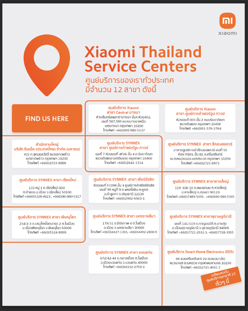 เสียวหมี่ ผู้นำเทคโนโลยีระดับโลก ให้ความสำคัญในเรื่องของบริการหลังการขายด้วยศูนย์บริการ 12 สาขาทั่วประเทศ และเตรียมเปิดสาขาที่ 13 เพิ่มภายในเดือนมิถุนายนนี้ พร้อมเปิดให้บริการ Xiaomi Call Center ในเดือนพฤษภาคมที่ผ่านมา