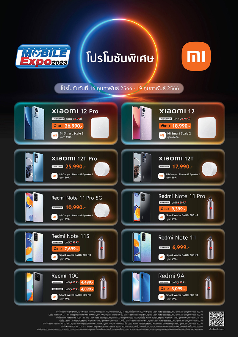 เสียวหมี่ ประเทศไทย เอาใจลูกค้าในงาน Thailand Mobile Expo ยกทัพสมาร์ทโฟนในทุกระดับราคามาจัดโปรโมชันพิเศษ อาทิ Xiaomi 12 Series, Xiaomi 12T Series, Redmi Note 11 Series, Redmi 10C และ Redmi 9A โดยโปรโมชันนี้จัดให้เฉพาะลูกค้าที่ซื้อสินค้าในงาน Thailand Mobile Expo ระหว่างวันที่ 16 – 19 กุมภาพันธ์ 2566 ณ ศูนย์การประชุมแห่งชาติสิริกิติ์ เท่านั้น