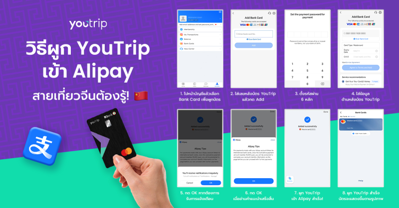- จ่ายผ่าน Alipay และ WeChat Pay โดยไม่สะดุด : สำหรับผู้ที่เดินทางไปประเทศจีน สามารถเพิ่มบัตร YouTrip เข้าใน Alipay และ WeChat Pay ง่าย ๆ ช่วยให้การใช้จ่ายสะดวกยิ่งขึ้น พร้อมรับเรทดีที่คุ้มค่าจาก YouTrip