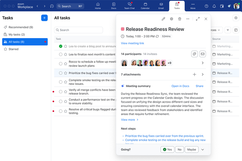 - Zoom Tasks และ AI Companion ช่วยให้ผู้ใช้สามารถค้นหา ดำเนินการ และจัดการงานต่าง ๆ ใน Zoom Workplace ได้อย่างง่ายดาย โดยสามารถตรวจจับรายการงานจากบทสรุปการประชุม แชท และอีเมลโดยอัตโนมัติ พร้อมทั้งช่วยดำเนินการต่าง ๆ อาทิ การกำหนดตารางการประชุมติดตามผลหรือสร้างเอกสารจากการประชุม งานต่าง ๆ จะปรากฎในแท็บใหม่ภายใน Zoom Workplace และสามารถฝังลงใน Zoom Doc ซึ่งจะสร้างพื้นที่ส่วนกลางสำหรับติดตามงานส่วนตัว งานของทีม และงานโครงการ ตั้งแต่เริ่มต้นจนเสร็จสมบูรณ์ ฟีเจอร์นี้คาดว่า จะเปิดตัวในช่วงปลายเดือนมีนาคม