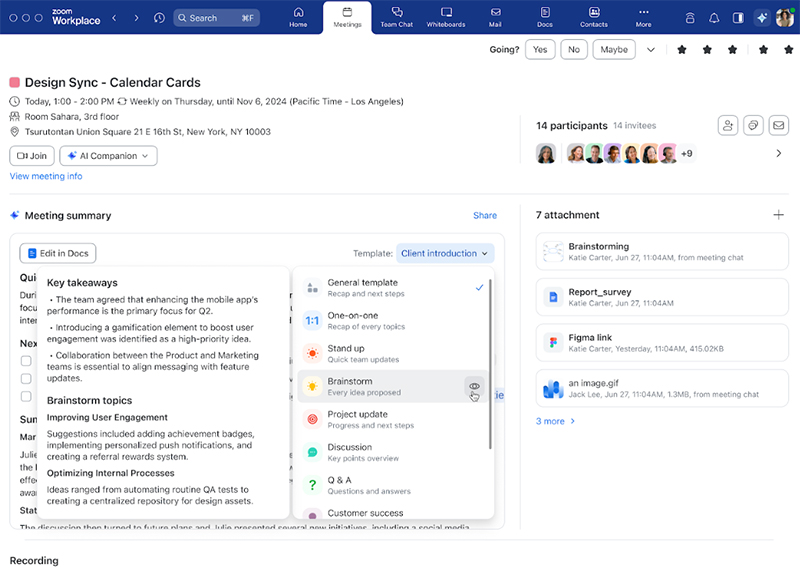 - วาระการประชุม (Meeting Agendas) และ AI Companion ซึ่งคาดว่าจะเปิดตัวในเดือนพฤษภาคม จะช่วยให้ผู้ใช้จัดระเบียบได้ง่ายขึ้น โดยใช้เทมเพลตหรือวาระการประชุมล่าสุดเพื่อแนะนำเนื้อหาที่เหมาะสม ผู้จัดการประชุมสามารถตั้งเวลาสำหรับแต่ละหัวข้อเพื่อให้การประชุมเป็นไปตามกำหนด และยังสามารถได้รับบันทึกการประชุมที่สร้างโดย AI แบบเรียลไทม์ระหว่างการประชุมได้ หลังการประชุม ผู้จัดการประชุมสามารถแชร์สรุปและรายการงานที่ต้องทำได้อย่างง่ายดาย